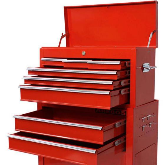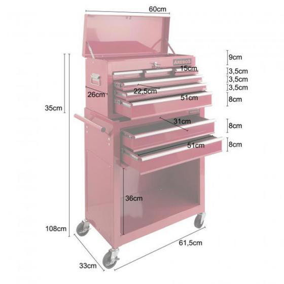 Merkmale: Ausführung: leer Anzahl Schübe: 8 Schubladen weitere Produktinformationen: Fachhöhe: 5x 35 mm / 3x 80 mm Innenmaße der Schübe: im Oberteil 510 x 225 mm / im Unterteil 510 x 310 mm (BxT) Material: Metall Farbe: rot Bereifung: 4 Lenkrollen, davon 2 mit Feststellern Rädermaße: 20 x 75 mm (BxØ) Gesamtmaße: Wagen 615 x 750 x 330 mm / Kiste 600 x 350 x 260 mm (BxHxT) Gewicht: 25,5 kg Lieferung direkt ab Werk! ACHTUNG: Sperrgut! sonstiges: Schubladen auf Teleskopschienen mit Vollauszug, Schubfächer mit Anti-Rutsch-Matten, 4 seitliche Lochhaken, Wagen mit 2 Schubladen und 1 Staufach für großes Werkzeug oder für mitgelieferte Werkzeugkiste, Werkzeugkiste mit 6 Schubladen, 1 Ablagefach, oberes Fach der Werkzeugkiste abschließbar