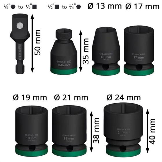 Impact-Aufnahme für robustes Eindrehen von Schrauben Steckschlüssel-Set mit 1/2 Zoll Vierkantaufnahme & Sechskant-Adapter Geeignet für Schlagschrauber mit Vierkantantrieb Sehr widerstandsfähig gegenüber hohem Drehmoment Phosphatbeschichtung zum Schutz vor Rost und Korrosion Farbkodierung und Laserbeschriftung erleichtert die Identifikation Mit Bohrung für Sicherungsstift oder Sicherungsfeder und Nut für O-Ring Merkmale: Werkzeugaufnahme: 1/2 Zoll Schlüsselweite: 13 mm, 17 mm, 19 mm, 21 mm, 24 mm weitere Produktinformationen: Länge: 38 mm (4x) / 40 mm Material: Chrom-Molybdän-Stahl Lieferung: inkl. 5 Steckschlüssel, 1/4 Zoll Sechskant-Adapter, 1/2 Zoll Vierkant-Adapter, Aufbewahrungsbox