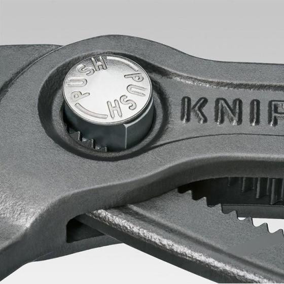 Feinverstellung per Knopfdruck direkt am Werkstück Selbstklemmeffekt für kraftsparendes Arbeiten ohne Abrutschen 3-teiliges Profi-Wasserpumpenzangen-Set in einer Kunststoffeinlage Klemmschutz verhindert Quetschverletzungen Sicheres Einrasten des Gelenkbolzens, keine unbeabsichtigte Verstellung Made in Germany Merkmale: Größe: 1 1/2 Zoll (36 mm), 2 Zoll (50 mm), 2 3/4 Zoll (70 mm) Länge: 180 mm, 250 mm, 300 mm Ausführung: mit Schnelleinstellung, Set weitere Produktinformationen: Einstellpositionen: 1x 18, 1x 25, 1x 30 Material: Chrom Vanadin Elektrostahl Griffe: rutschhemmender Kunststoff Zertifikat: DIN ISO 8976 Lieferung: inkl. 3 Cobra Wasserpumpenzangen (87 01 180, 87 01 250, 87 01 300)
