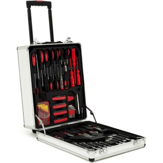 Merkmale: Ausführung: gefüllt, Trolley geeignet für: universal Material: Aluminium weitere Produktinformationen: Verschluss: 2 Steckschlösser abschließbar: ja, 2 abschließbare Steckschlösser Material Werkzeug: Werkzeug-Stahl Maße: (BxHxT) 370 x 500 x 230 mm Lieferung: inkl. 899 Teile sonstiges: ergonomische Griffe für guten Halt, Kantenschutz, abschließbar inkl. Ersatzschlüssel, extra Tragegriff, Arbeitskomfort durch mitgelieferte Handschuhe, vier praktische und herausnehmbare Schubladen ermöglichen es Ihnen, das Werkzeug schnell und gut sortiert zu entnehmen, die Rollen an der Unterseite des Koffers und der praktische, ausziehbare Teleskopgriff machen Sie mit Ihrem Werkzeug mobil und schnell einsatzbereit, Koffer für Haushalt, Werkstatt, Auto oder Fahrrad, Gewicht 14 kg Set 1 Ringschlüssel (8/9/10/11/12/13/14/15/17 mm): 9 Teile Kombizange: 1 Teil Seitenschneider: 1 Teil Spitzzange: 1 Teil Wasserpumpenzange: 1 Teil Rollgabelschlüssel: 1 Teil Set 2 Kabelschuh Presszange: 1 Teil Universalmesser: 1 Teil Klauenhammer: 1 Teil Schere: 1 Teil Heißklebepistole: 1 Teil Patrone: 2 Teile Wasserwaage – Lineal: 1 Teil Maßband 5m: 1 Teil Isolierband, schwarz: 1 Teil Kunststoffklammern: 2 Teile 500x Kabelschelle: 1 Teil Kleinteilesortiment: 1 Teil Set 3 magnetische Schraubendreher (5x Kreuz + 4x Schlitz): 9 Teile magentische Knirpsschraubendreher (Kreuz + Schlitz): 2 Teile vollisolierte Schraubendreher: 3 Teile Ratschenschraubendreher: 1 Teil 6-teiliges Präzisionsschraubendreher-Set: 1 Teil 12-teiliges Bit-Set, Kreuz, Schlitz, Innenvielzahn: 4 Teile Inbusschlüssel: 16 Teile magnetischer Bithalter: 1 Teil Druckprüfer: 1 Teil elektrischer Tester (100-250V): 1 Teil Set 4 Steckschlüsseleinsätze 1/4 mit Flankensystem (4-14 mm): 15 Teile Steckschlüsseleinsätze 1/2 mit Flankensystem (8-30 mm): 14 Teile 1/4 Verlängerung: 2 Teile 1/2 Verlängerung: 2 Teile 1/4 Kreuzgelenk: 1 Teil 1/2 Kreuzgelenk: 1 Teil flexible Verlängerung: 1 Teil T-Knebel 1/4: 1 Teil T-Knebel 1/2: 1 Teil Zündkerzeneinsätze 1/2 mit 16 und 21 mm: 2 Teile Schraubendreher mit 1/4 Vierkantaufnahme: 1 Teil Umschaltknarre 1/2 Ratsche: 1 Teil Umschaltknarre 1/4 Ratsche: 1 Teil 1 Paar Arbeitshandschuhe Kunstleder (Farbe kann variieren) 2 Paar Arbeitshandschuhe Feinstrick (Farbe kann variieren)